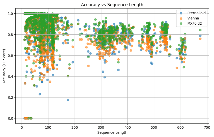 Analyzed deep learning models (EternaFold, MXFold2) for RNA structure prediction across varying sequence lengths and motifs. Utilized Mxfold2 to identify new sequence liabilities for RNA constructs.